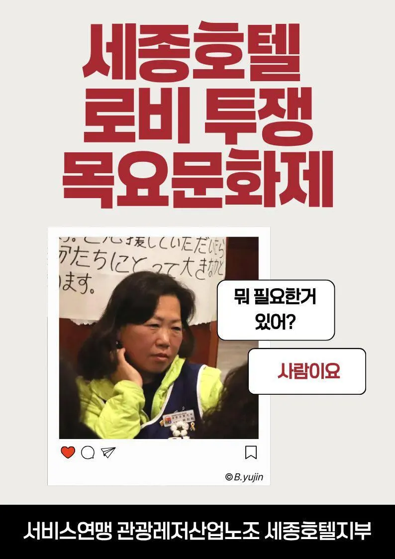 우리 지부는 대의원 1/3 이상의 제안과 집행위원회의 검토를 거쳐 세종호텔 로비 투쟁 목요문화제 참석을 결정했습니다. 조합원 동지 여러분의 많은 관심을 부탁드립니다.
