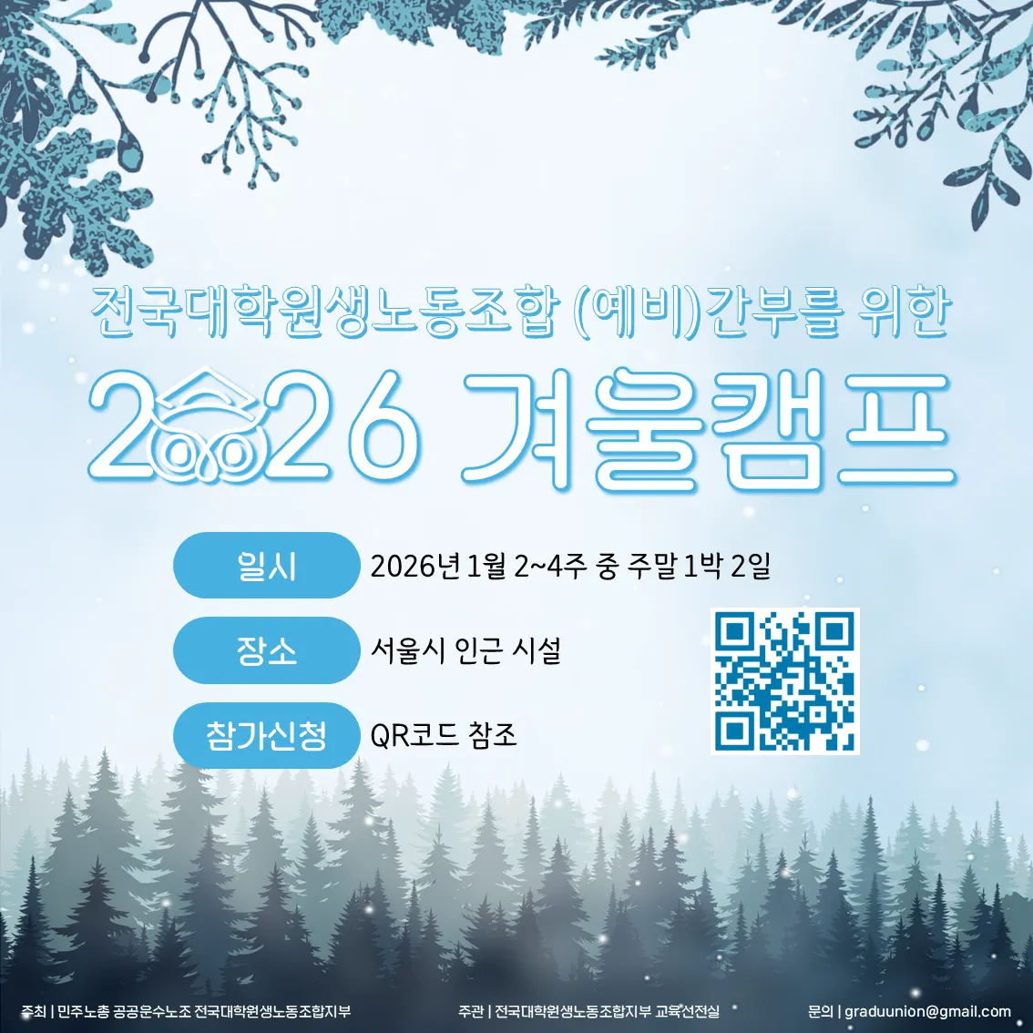 대학원생노조는 1월 중으로 (예비)간부 동지들을 대상으로 겨울캠프를 진행할 예정입니다. 이에 수요조사를 실시하오니 많은 참여 부탁드립니다.