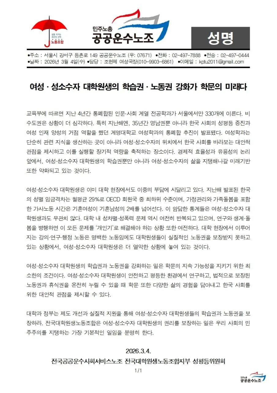 전국공공운수사회서비스노조 전국대학원생노동조합지부 성평등위원회