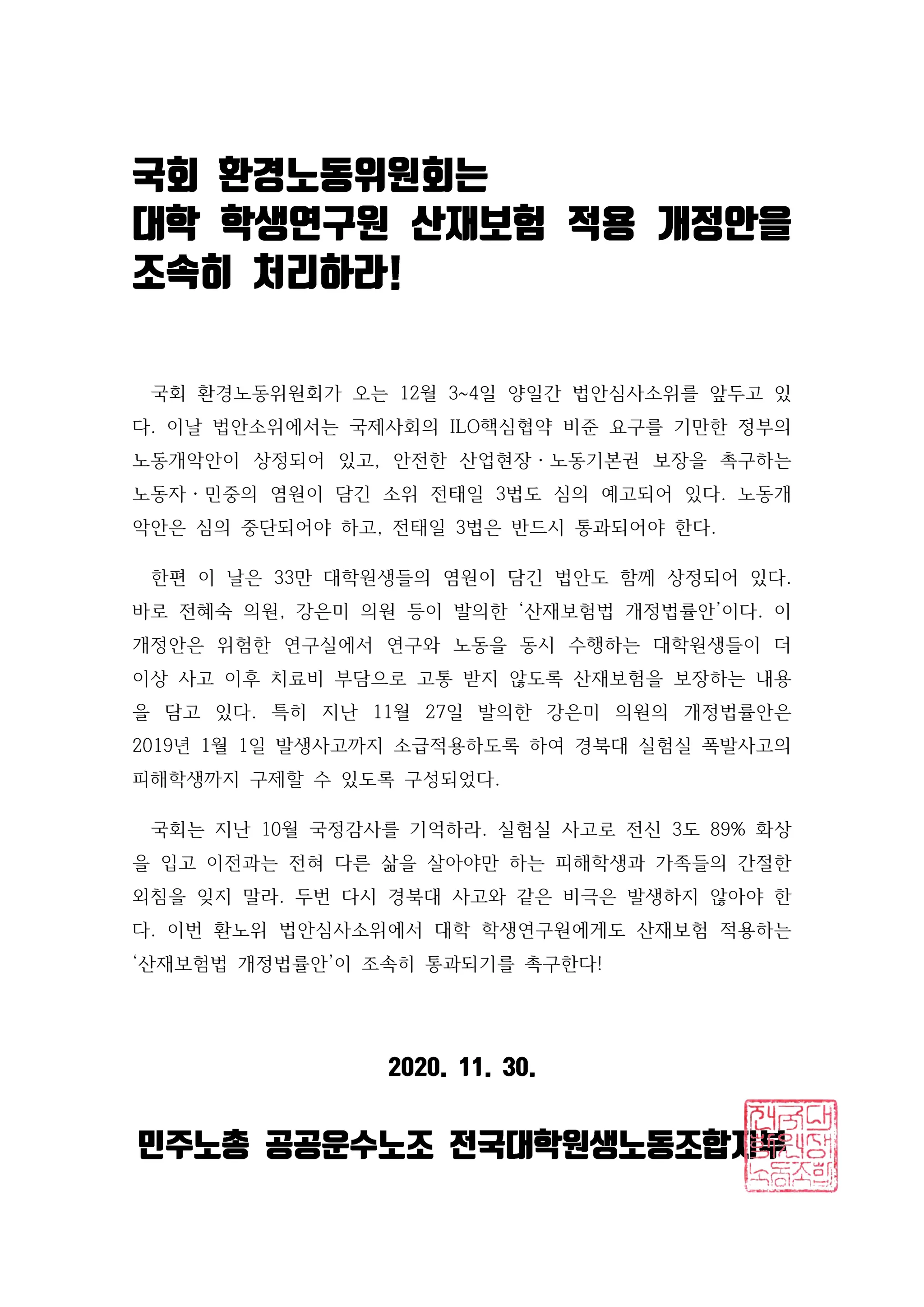 국회는 지난 10월 국정감사를 기억하라. 실험실 사고로 전신 3도 89% 화상을 입고 이전과는 전혀 다른 삶을 살아야만 하는 피해학생과 가족들의 간절한 외침을 잊지 말라. 두번 다시 경북대 사고와 같은 비극은 발생하지 않아야 한다. 이번 환노위 법안심사소위에서 대학 학생연구원에게도 산재보험 적용하는 ‘산재보험법 개정법률안’이 조속히 통과되기를 촉구한다!