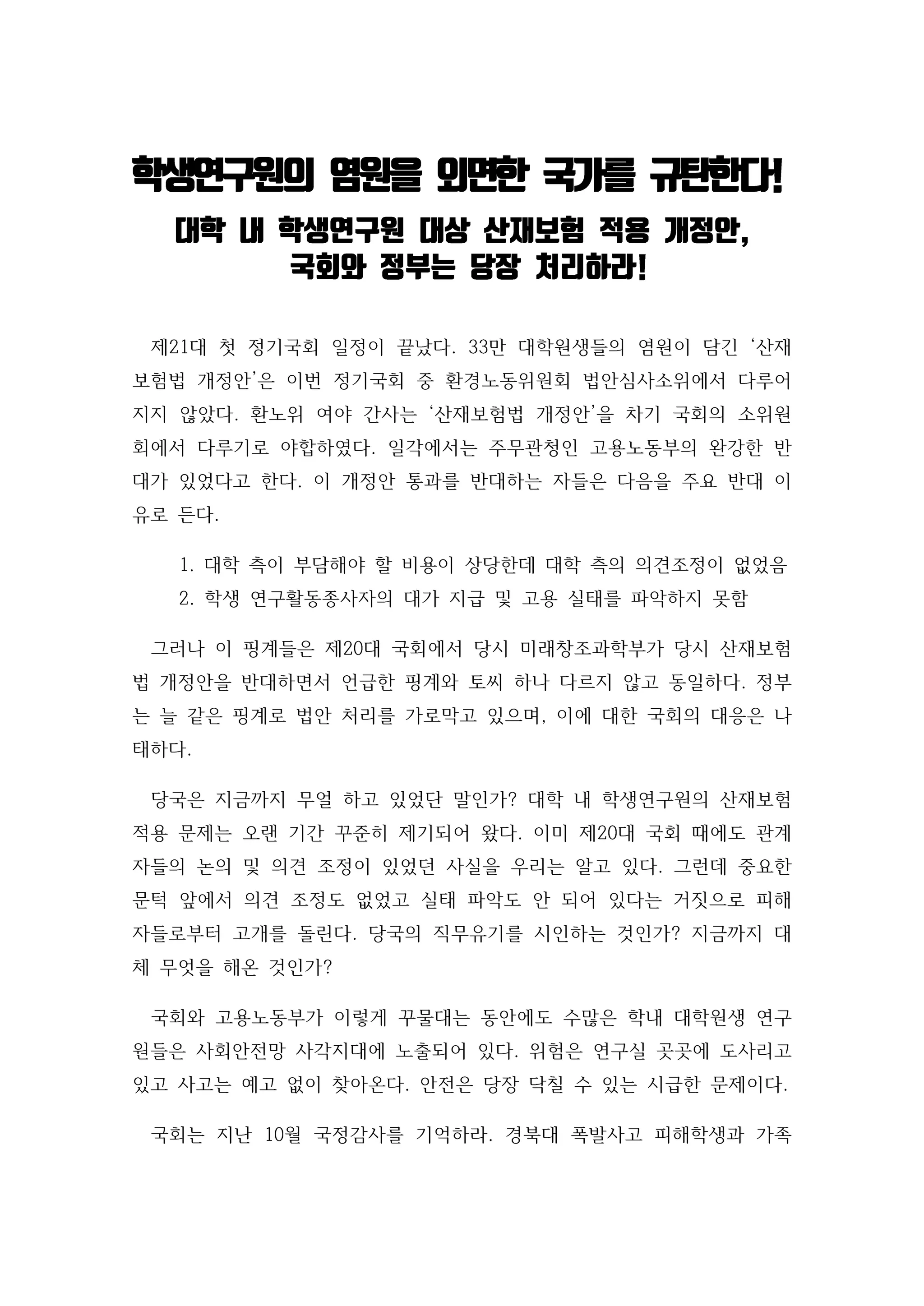 당국은 지금까지 무얼 하고 있었단 말인가? 대학 내 학생연구원의 산재보험 적용 문제는 오랜 기간 꾸준히 제기되어 왔다. 이미 제20대 국회 때에도 관계자들의 논의 및 의견 조정이 있었던 사실을 우리는 알고 있다. 그런데 중요한 문턱 앞에서 의견 조정도 없었고 실태 파악도 안 되어 있다는 거짓으로 피해자들로부터 고개를 돌린다. 당국의 직무유기를 시인하는 것인가? 지금까지 대체 무엇을 해온 것인가?