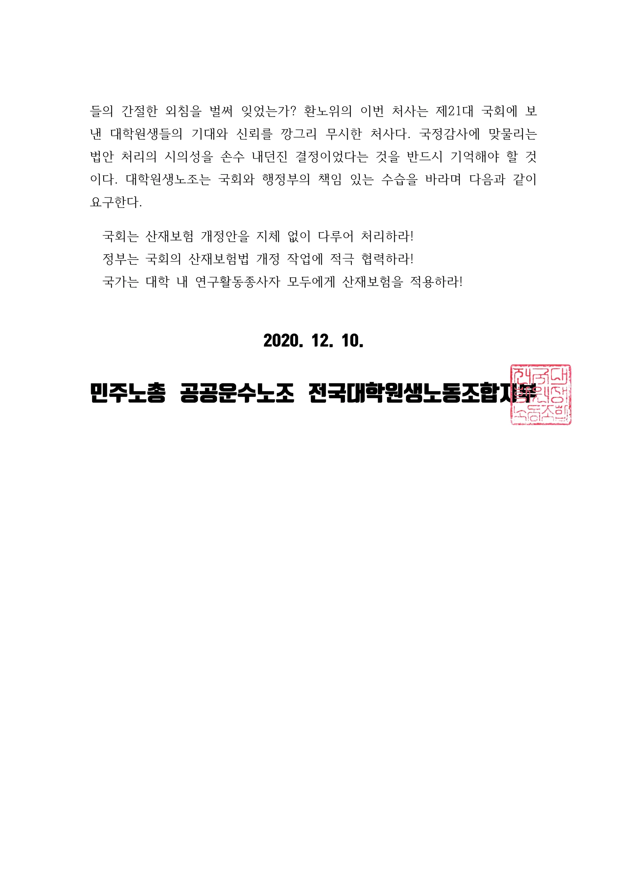 국회는 지난 10월 국정감사를 기억하라. 경북대 폭발사고 피해학생과 가족들의 간절한 외침을 벌써 잊었는가? 환노위의 이번 처사는 제21대 국회에 보낸 대학원생들의 기대와 신뢰를 깡그리 무시한 처사다. 국정감사에 맞물리는 법안 처리의 시의성을 손수 내던진 결정이었다는 것을 반드시 기억해야 할 것이다. 대학원생노조는 국회와 행정부의 책임 있는 수습을 바라며 다음과 같이 요구한다.