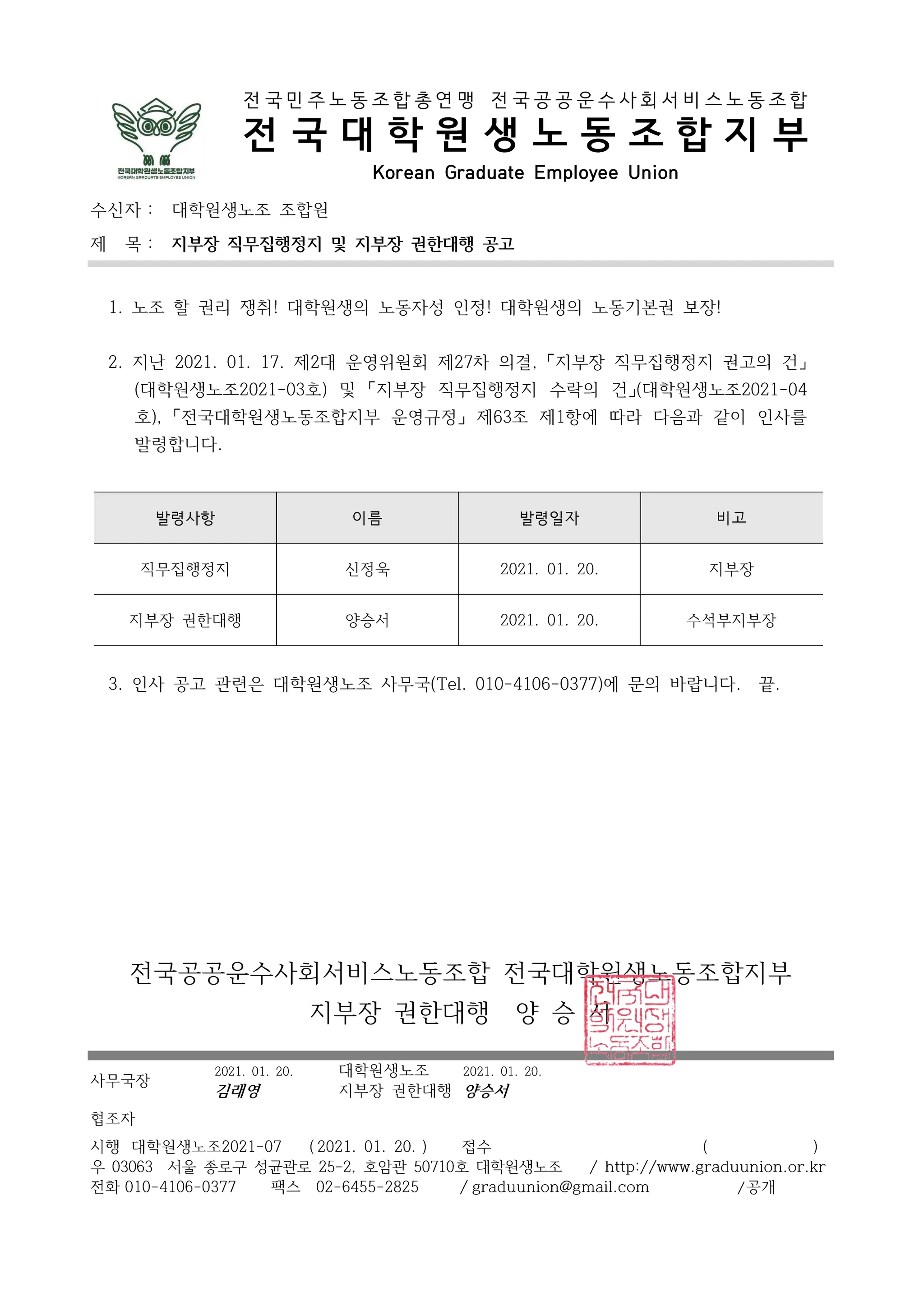 이 조사와 그에 대한 판단은 대학원생노조의 미래를 결정지을 중대한 사건이 될 것이라 생각합니다. 대학원생노조가 지속적으로 대학원생 노동자의 권리를 수호할 수 있도록, 저는 지부장 권한대행으로서 맡은 바 성실히 임무를 수행하겠습니다.