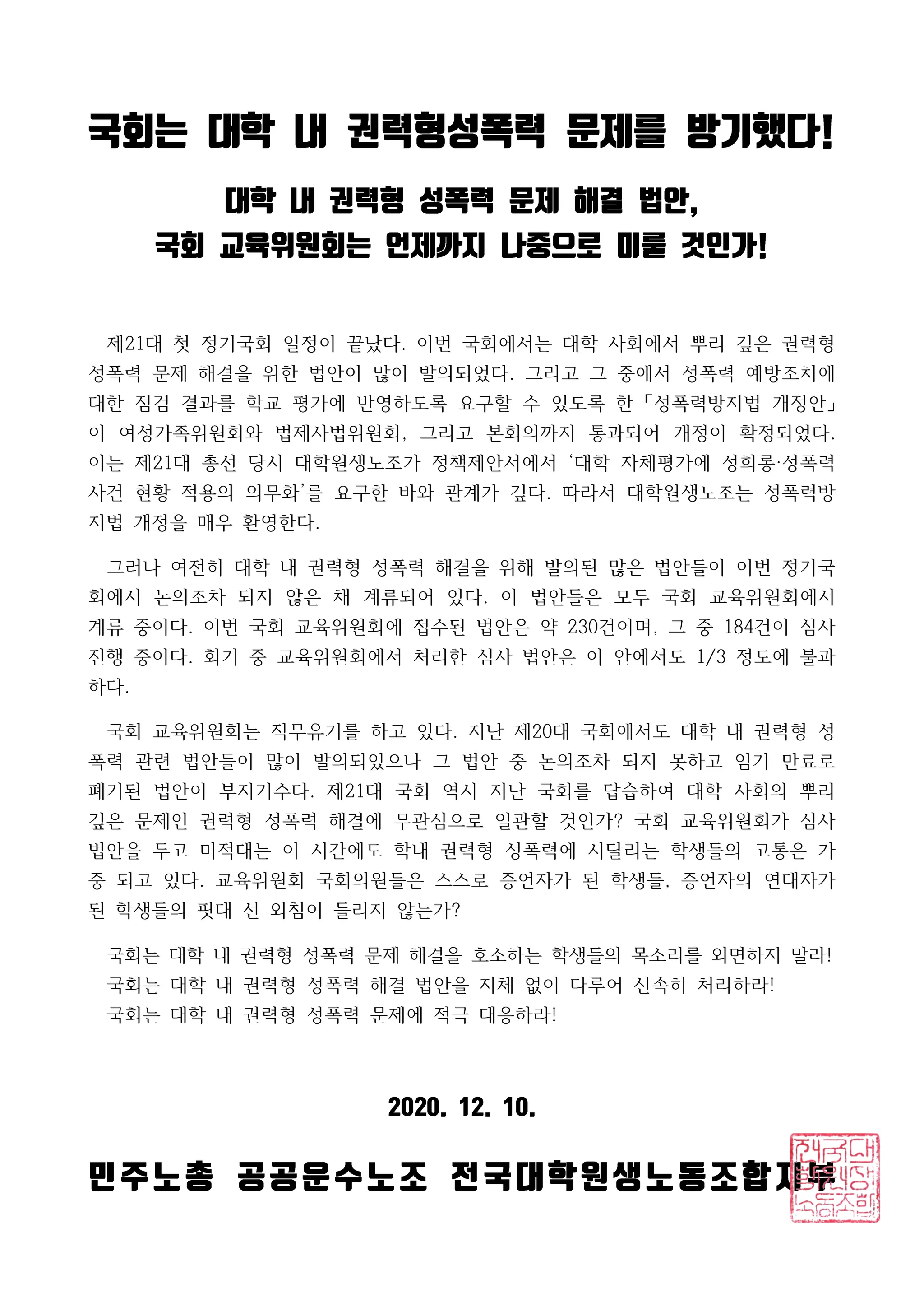 국회 교육위원회는 직무유기를 하고 있다. 지난 제20대 국회에서도 대학 내 권력형 성폭력 관련 법안들이 많이 발의되었으나 그 법안 중 논의조차 되지 못하고 임기 만료로 폐기된 법안이 부지기수다. 제21대 국회 역시 지난 국회를 답습하여 대학 사회의 뿌리 깊은 문제인 권력형 성폭력 해결에 무관심으로 일관할 것인가? 국회 교육위원회가 심사 법안을 두고 미적대는 이 시간에도 학내 권력형 성폭력에 시달리는 학생들의 고통은 가중 되고 있다. 교육위원회 국회의원들은 스스로 증언자가 된 학생들, 증언자의 연대자가 된 학생들의 핏대 선 외침이 들리지 않는가?